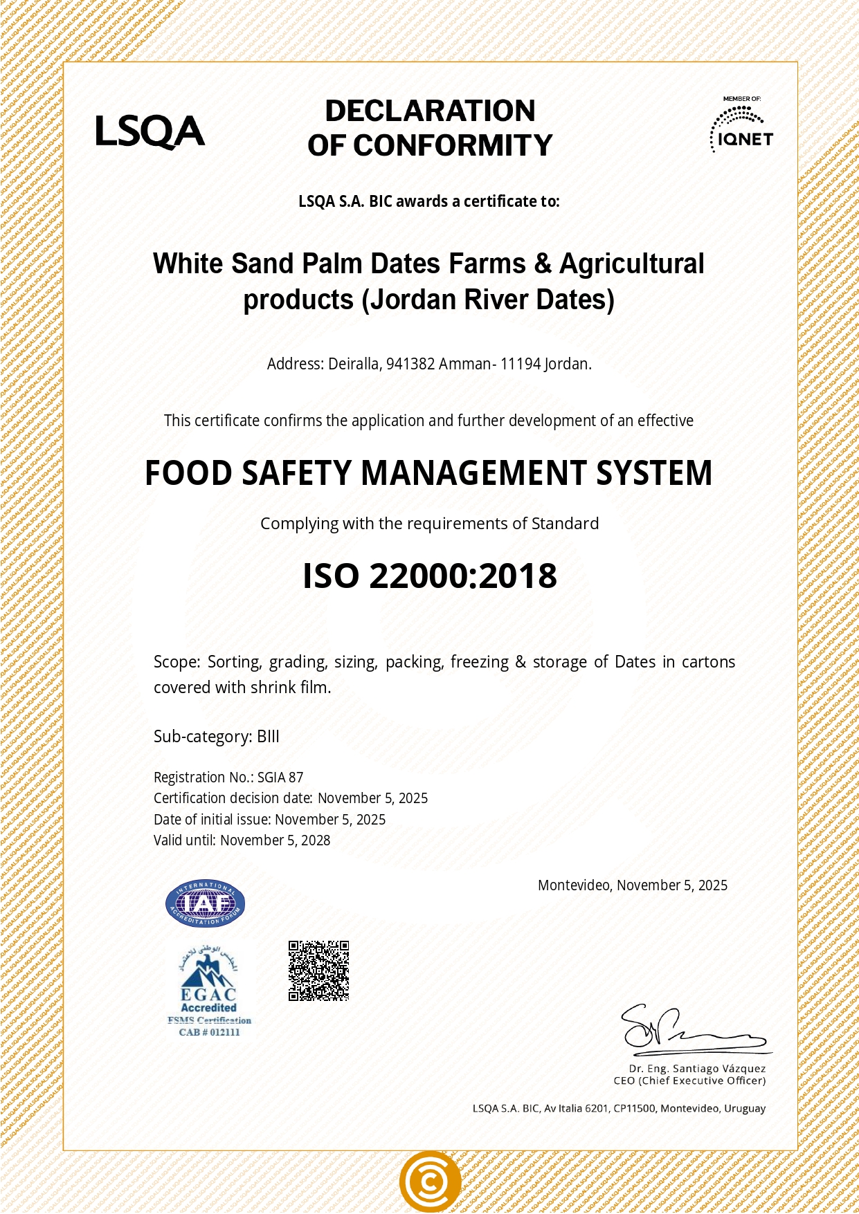 الحصول على هذه الشهادة يؤكد أن تمور نهر الأردن تطبق نظامًا فعالًا لإدارة المخاطر الغذائية وضمان جودة المنتج في جميع مراحل الإنتاج والمعالجة.
